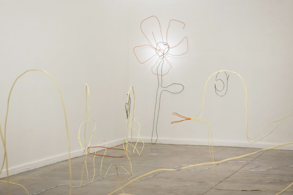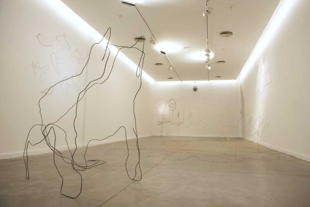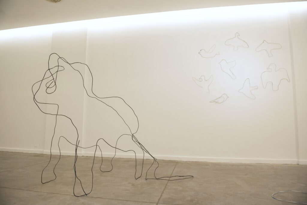 Las líneas de hierro trazan afirmaciones mínimas: “aquí hay un pájaro”. Pero a pocos centímetros, donde la línea se interrumpe, no hay nada. En ese borde, el artista actúa como un equilibrista inestable, sosteniendo las formas por pequeños puntos de apoyo que apenas las mantienen en pie. Ya sea un pato o un grifo del que brota agua, las esculturas parecen respirar entre la levedad y el colapso. Es el ojo del espectador el que impide la caída, completando las figuras con su mirada e imitando el temblor de las formas. Ullua hace con el hierro lo que un poeta hace con el lenguaje.